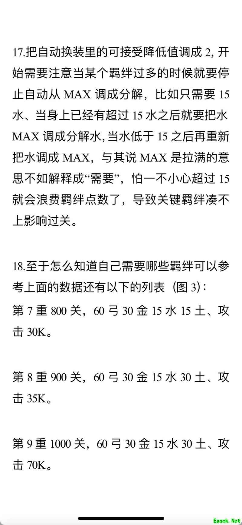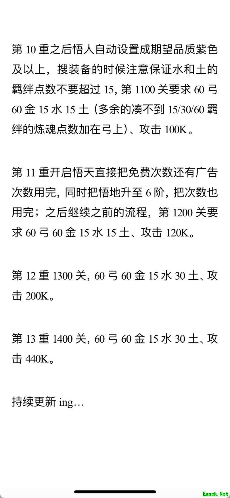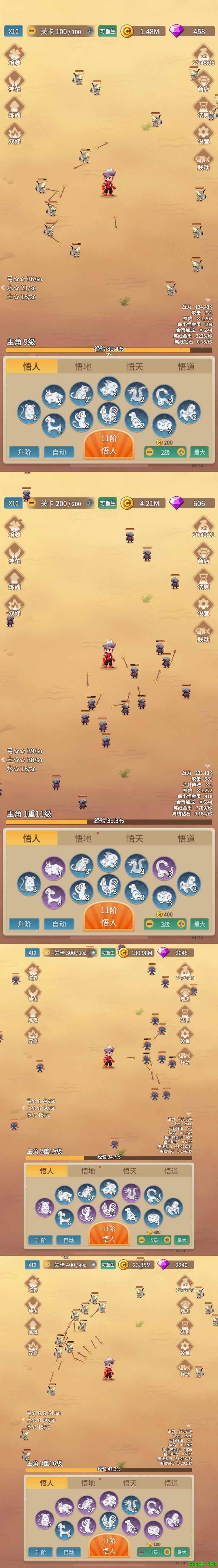 在逐步提升装备的同时向上挑战,可顺利通关。越高层的小怪掉落金币越多,当弓达到30级,并拥有水、金、土任意一种属性达到15级后,即可挑战第100关,此时攻击力约为3000至4000之间。