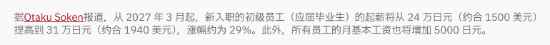 据报道,自2027年3月起,刚毕业入职的员工起薪将从24万日元(约10378元)提升至31万日元(约13405元),涨幅约为29%。此外,公司所有员工的月基础工资也将统一上调5000日元。