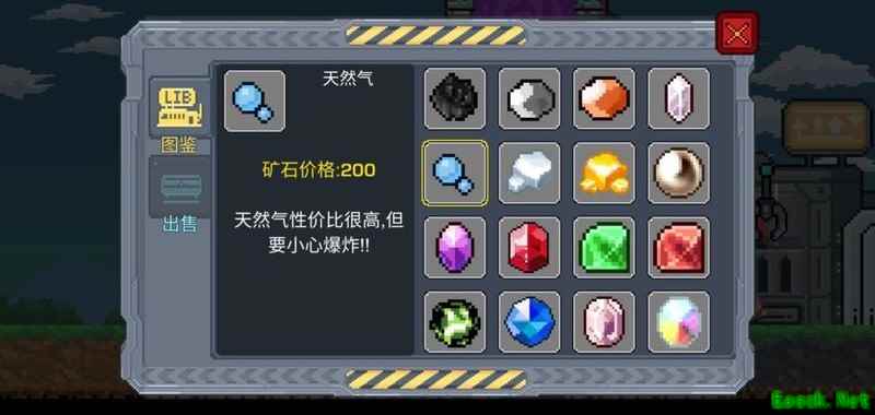 矿石共分为22种,包含15种普通标准矿石,无特殊效果,价值随出现顺序递增。另有两类特殊矿石:天然气与钻石类。天然气在采集时有30%概率发生爆炸,使用炸药引爆同样存在该风险,爆炸造成相当于5%最大生命值加上31点的伤害,但新手装备也能承受两次而不致死,其价值为200,刚刷新时远高于同层其他矿石。钻石类包括钻石和愿望石(又称龙珠),采集钻石固定获得1颗钻石,愿望石则随机产出2至5个。此外还有四种稀有矿石,仅在深度超过8000后极低概率刷新,极为罕见,不会干扰标准矿石的正常生成。