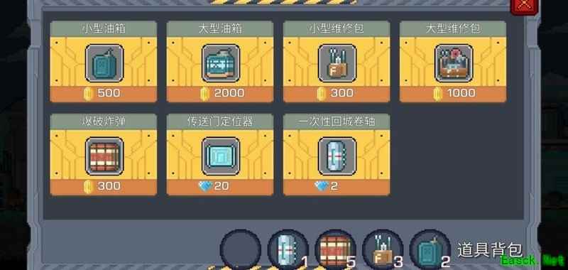 可携带的工具有五类,每种最多携带五个,但大传送和炸药例外。大小修复工具用于回复生命值,尚未使用过,建议准备几个小型以备不时之需。大小油箱用于补充油量,小型油箱可恢复约500油量,同样建议多带几个小号备用。炸药是常用道具,适合在垂直挖掘或冲刺深度时使用,能炸毁所在格子周围的八个格子,有效应对岩浆、落石及虫类威胁,同时采集周围区域的矿产资源,当前版本最多可携带20个。传送类工具包括小传送和大传送:小传送花费2钻,一次性返回城镇,无法回到原点;大传送需20钻建立永久传送门,可通过门往返原位置,最多同时存在两个,花费100钻可永久增加一个名额,已建传送门可在原地拆除。所有道具中仅允许携带五种类型,合理搭配是高效探险的关键。