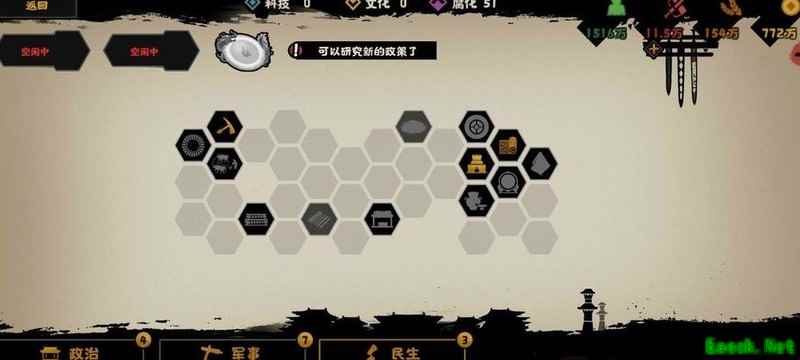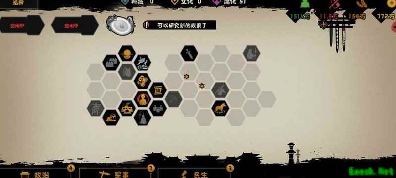 科技政策上,我动用了四辆物资车,后续调兵成本过高;若无物资车,可向南越与夜郎出售物品以获取资源。