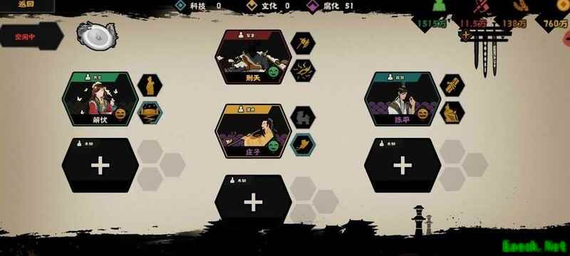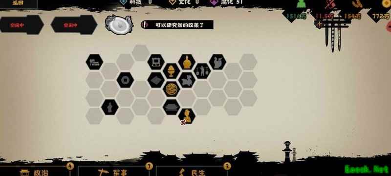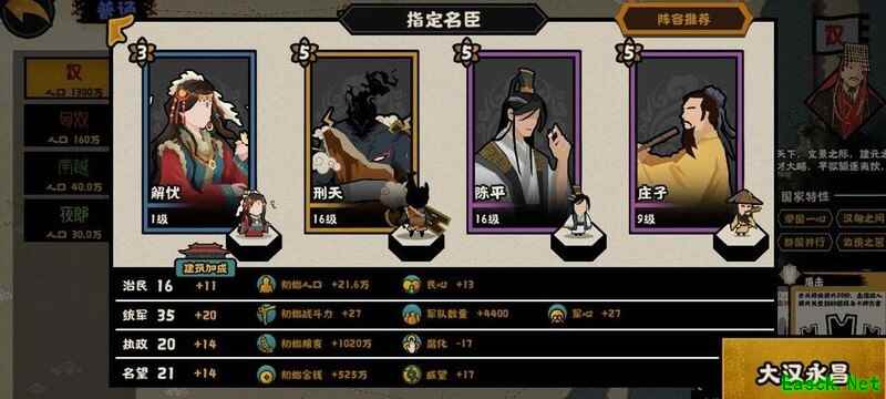 进入名臣政策界面,依次选择解忧的两项政策、刑天的两项政策、陈平的解围政策以及庄子的蝶梦庄周技能。