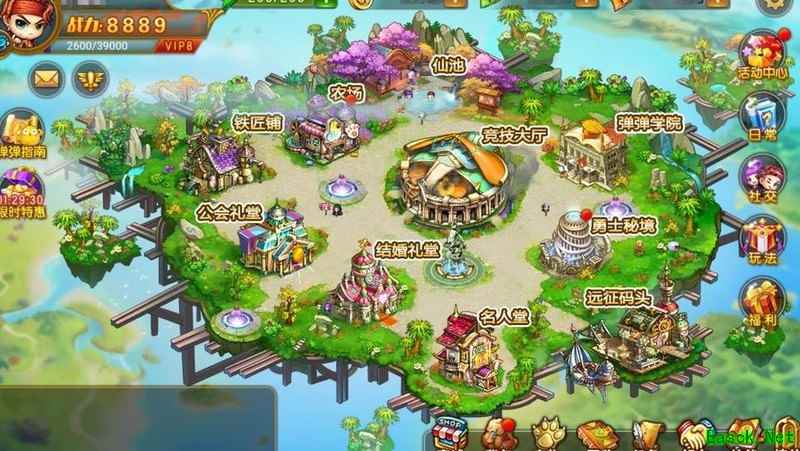 进入游戏后,首先进入主界面,界面包含多种建筑与功能选项。
