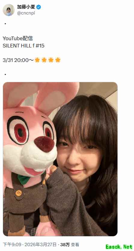 《寂静岭f》中女主深水雏子的演员加藤小夏曾在Youtube直播《寂静岭f》,自上次通关后,加藤小夏久违又宣布将直播游玩《寂静岭f》: