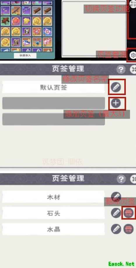 水晶储物柜支持页签分类,最多可设三个,通过右下角的页签管理进行设置。