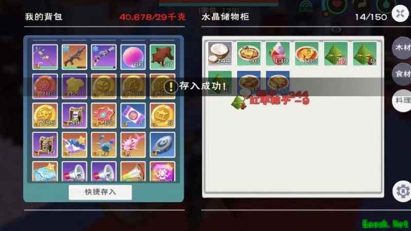 将可堆叠物品如椰子放入柜子,使用快捷存入功能,背包内所有同类物品会自动全部移至柜中。