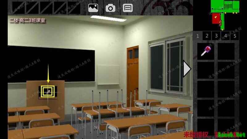 从医务室另一侧的门离开,抵达一楼中廊,使用开启一扇门,进入高一2班教室,拾取放在室内的。