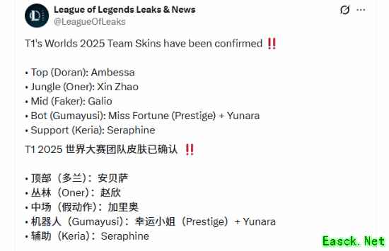近日,外网专注于LOL英雄联盟领域爆料的博主@LeagueOfLeaks爆料了这次2025年T1世界冠军的皮肤选择。
