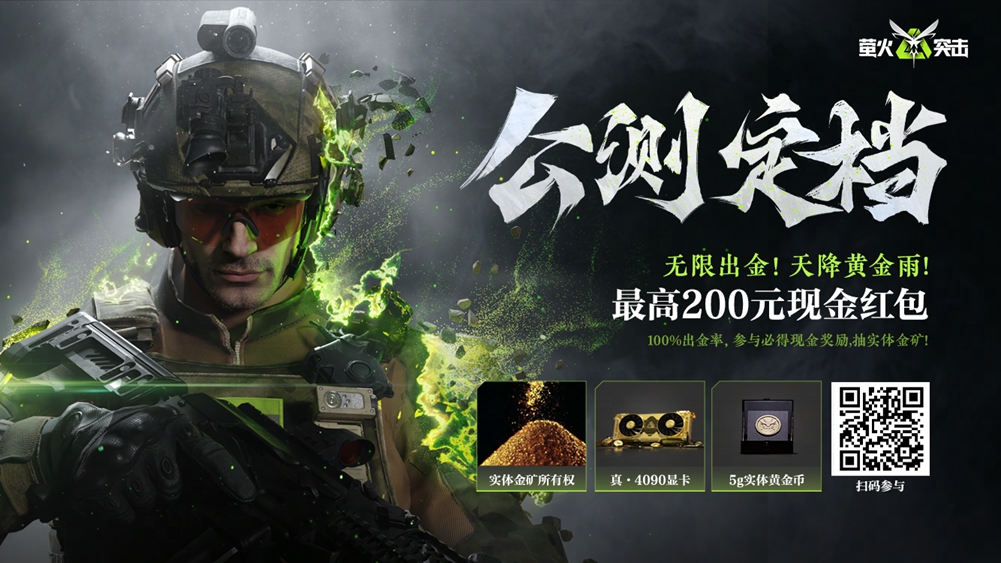 除端内持续进行的参与测试领取双份礼赠及最高达200%公测返利外,《萤火突击》公测定档追加福利抽送金矿。参与指定活动,即可领100%现金奖励!