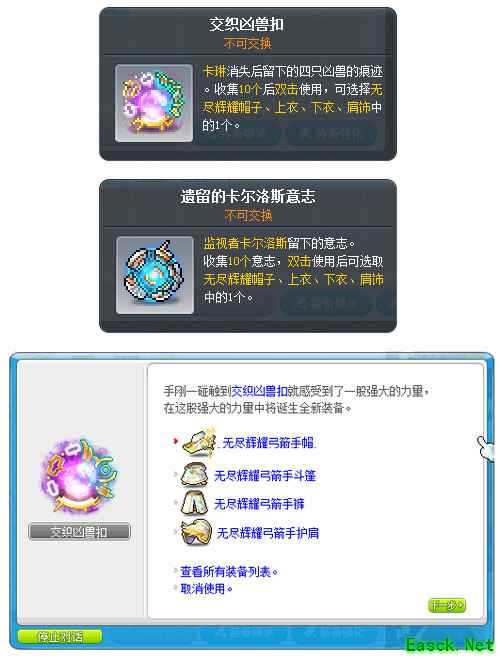 自V224版本更新后,以下道具中可获得的无尽辉耀装备变更为帽子、上衣、下装、肩饰。