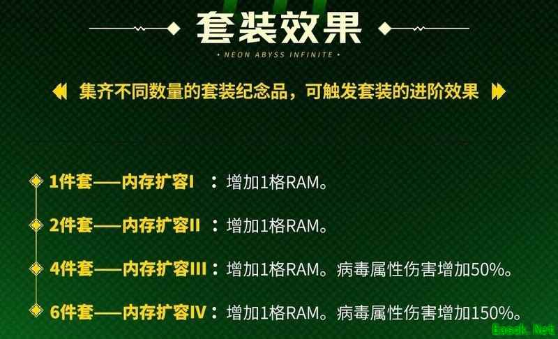 病毒第一系列共有14款纪念品,围绕毒属性伤害或效果进行强化或被强化。收集更多套装部件可解锁更强的套装效果,主要提升携带RAM的上限及增强毒属性伤害。