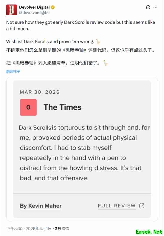 也正是抓住这一点,Devolver Digital直接下场“开团”,晒出了一条The Times评测旗下新游《Dark Scrolls》的图片(并非真实评测),采用了和《The Times》评价《马里奥银河》相同的表述。