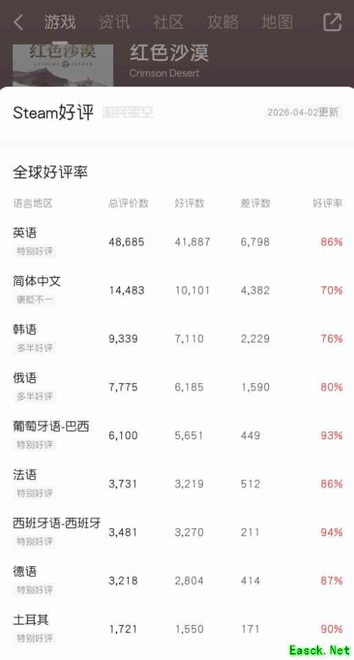截至 2026 年 4 月 2 日,简体中文区总评价数已达14,483条,其中好评数为10,101条。虽然目前的70%好评率仍处于“褒贬不一”的边缘,但相比发售首周已有了质的飞跃。