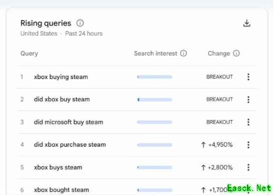 谷歌趋势数据显示,与Xbox相关的搜索中,“Xbox收购Steam”“Xbox买下Steam了吗”“Xbox真的买了Steam吗”等关键词突然飙升——涨幅超过5000%。