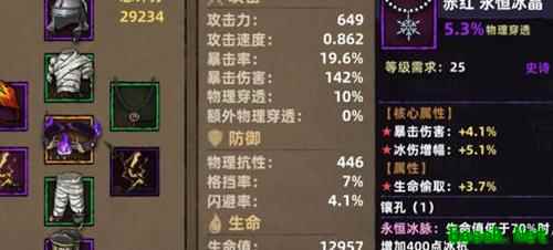 选择装备时,优先高攻击武器,具备穿透或暴击属性更佳。其他部位属性优先级为:暴击与攻击并重,其次为物穿、爆伤、吸血;生存方面则生命值优先,随后是物抗和元素耐性。若难以刷出理想装备,可花费少量金币在商店购买或前往铁匠铺洗练。建议准备一条穿透项链,自第六章起,穿透属性将愈发关键。