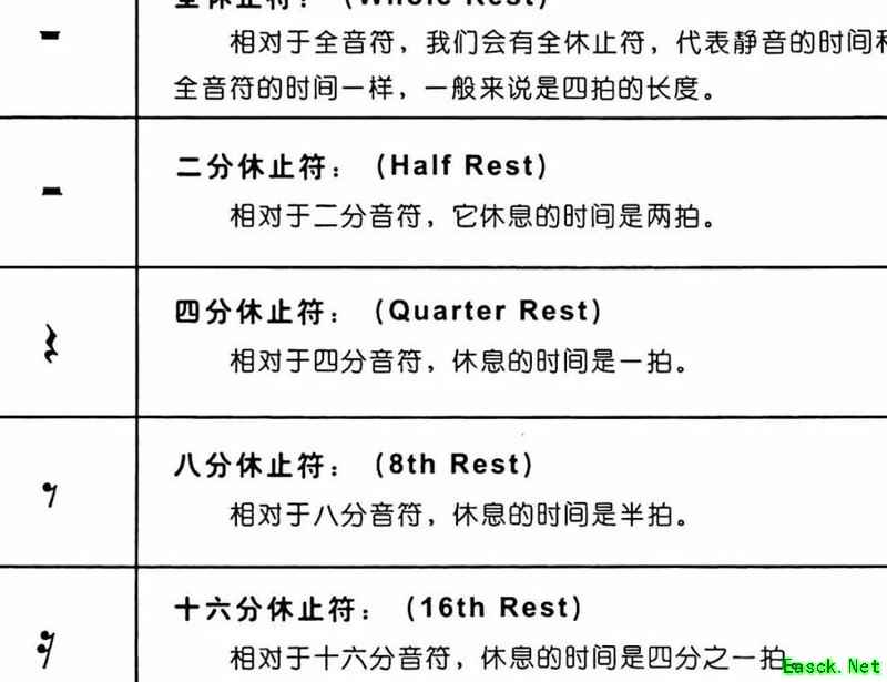 接下来谈谈休止符的问题,上期未提及。它出现时需保持静默,如同简谱中的0,具体形态见图示。