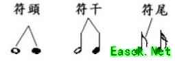 音符通常由三个部分构成:圆形的符头、连接其上的竖直符干,以及从符干末端延伸出的弯曲符尾。符头为实心圆点,符干为直线,符尾呈波浪状,三者共同组成不同类型的音符。
