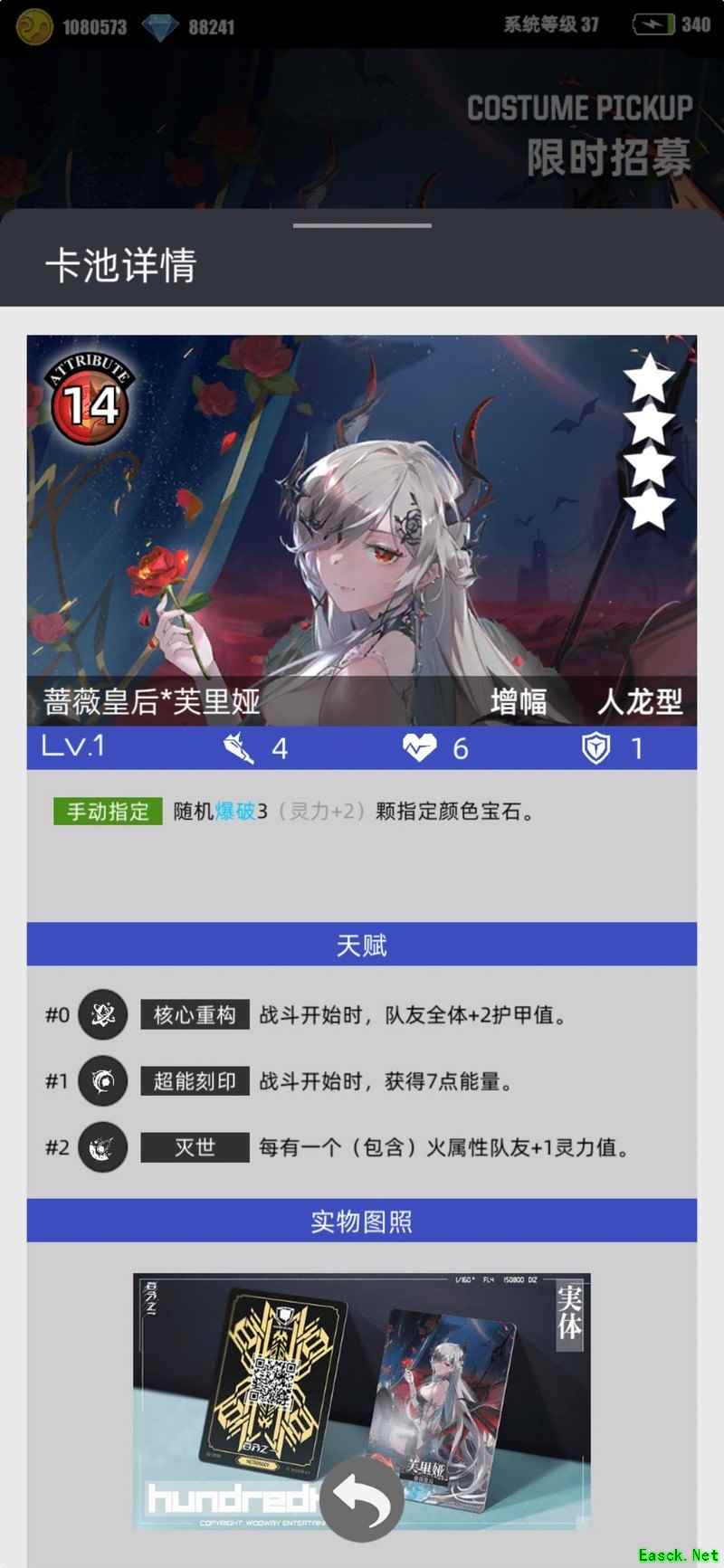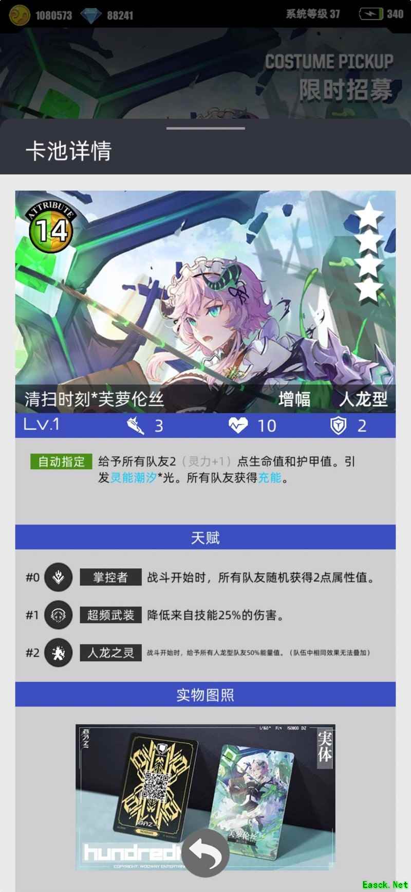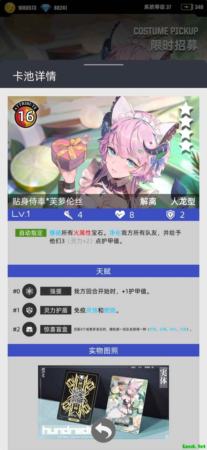 整体表现尚可,三天赋予后可作为人龙队的辅助角色,但该角色自身并不能获得50%的能量加成,因此想快速释放技能并不现实。若叠加灵力护甲,勉强能达到类似小马哥的护甲效果,尤其在50层以下时,对队友有一定的保护作用。