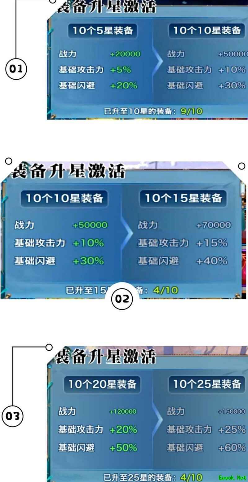 升星与强化相似,分为护具、首饰、衣服、武器四类,每类所需道具数量一致。
