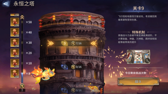 永恒之塔共九关,可以在进入关卡前选择恰当的词条来提高关卡的难度来获得更高的奖励,根据所有关卡的难度加成总和可以领取大量「庆典鞭炮」、「庆典烟火」。「庆典鞭炮」、「庆典烟火」可以在活动商店中兑换阿诺菈专属神器、卡莉斯特专属神器、5星通灵体等海量养成福利。