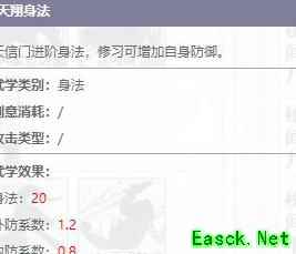 修炼天翔身法可提升身法属性,所增数值以1.2倍转化为外功防御,0.8倍转化为内功防御,从而增强整体防御能力。
