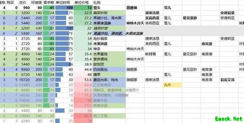 E列需求数指每提升3300点好感度所需制作的食物数量,即提升单位好感度的平均食物消耗量。
