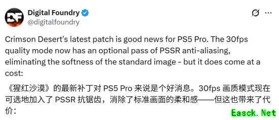 今日,《红色沙漠》推出全新更新,在修复大量BUG的同时,也为PS5 Pro带来了重磅画质升级。著名硬件评测机构Digital Foundry(数毛社)也在第一时间对此发表了自己的看法。