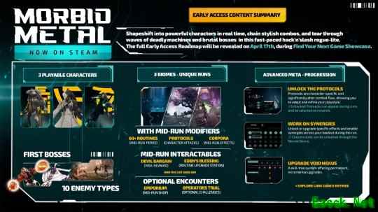 在这款快节奏的砍杀类roguelite游戏中,玩家可操作三个可玩角色,打出威力惊人的连击,撕裂一波波致命的机器大军,迎战残忍无情的首领敌人。