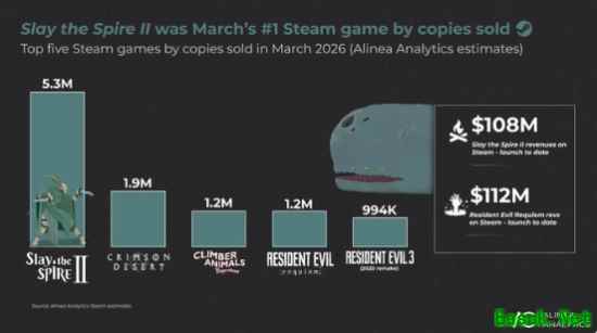 三月份,《绯红沙漠》原本被很多玩家寄予厚望,但《杀戮尖塔2》却抢走了它的热度,尤其是在Steam销量上。Alinea Analytics的分析员Rhy Elliott估算,这款游戏卖出了530万份,赚了1.08亿美元,直接成为当月Steam平台最畅销的游戏。