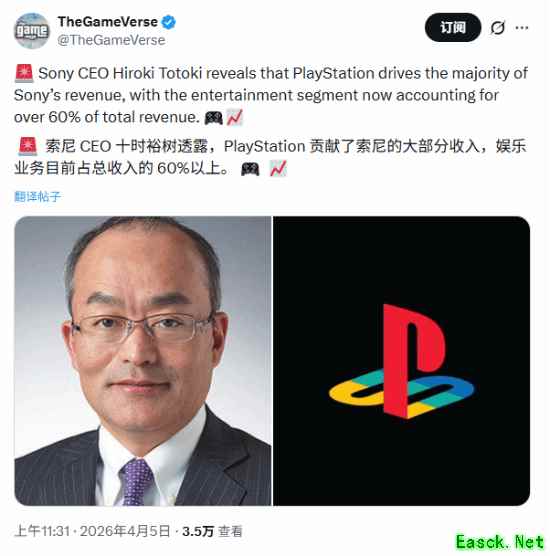 索尼总裁,首席执行官十时裕树在接受彭博社采访时谈到了游戏业务的重要性。