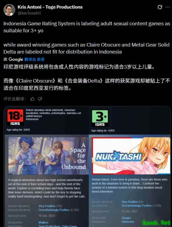 这一判定也引发了业内争议。印尼开发商Toge Productions的负责人曾公开质疑IGRS标准存在不一致问题:部分包含明显成人内容的游戏被评为低龄级别,而一些高质量作品却被直接“封杀”。