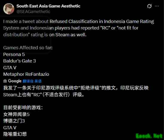 被标记为“RC”意味着游戏在印尼境内无法进行合法宣传、销售或数字/实体发行。随着IGRS逐步接入Steam平台,越来越多游戏开始受到其评级影响。包括《给他爱5》《博德之门3》《女神异闻录5》等作品也被评为RC,引发玩家对未来大作发行的担忧。