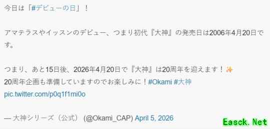 4月5日经典名作《大神》官方宣布游戏推出20周年新策划正在准备中,另外原作导演神谷英树再次导演《大神》新游正在开发中,敬请期待。