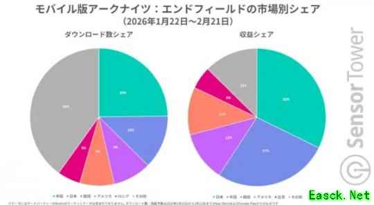 来自SensorTower的关于手游版《明日方舟》的游戏数据新调查数据报告显示,2026年1月22日~2月21日期间,其中国内下载量世界登顶占25%,是第二名日本的两倍多,但是收益却是日本游戏登顶,占据世界三成多。