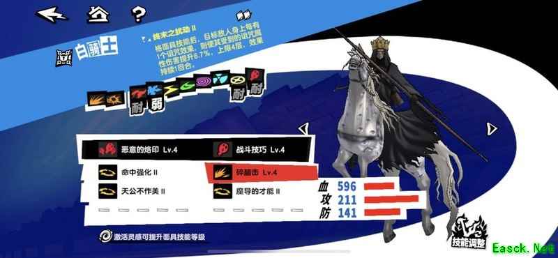 白骑士是四阶面具中强度最高的存在,被称为四阶面具的唯一真神。每当目标敌人身上有一个诅咒效果时,就会使其受到的诅咒额外增加28%,最多叠加4层,效果持续2回合。其实力毋庸置疑,堪称顶尖。