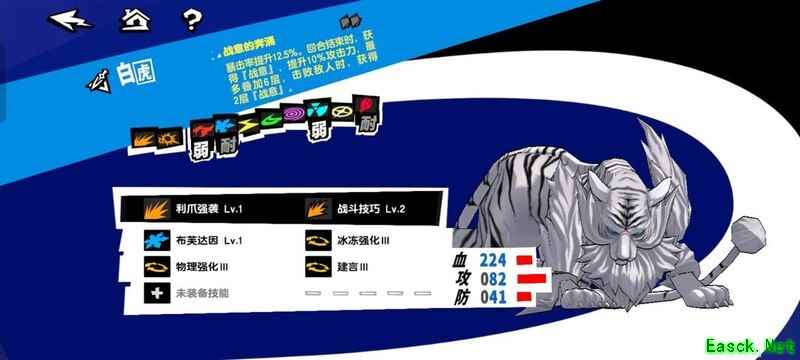 白虎适合中期冰队或龙司输出,全面的面板属性,暴击率较高,攻击最高可提升60%,但需击杀敌人才能获得加成,技能包含物理与冰系,对残血敌人伤害提升,是杰克霜精的优质替代选择。