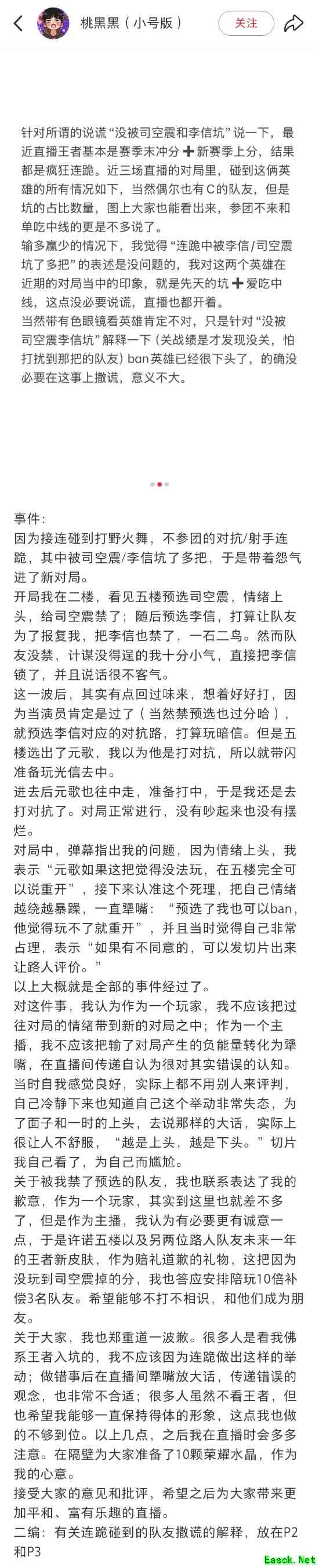 4月6日,知名网红主播桃黑黑针对近期在《王者荣耀》游戏直播中恶意禁用队友预选英雄、并与直播间观众“犟嘴”的行为正式发布道歉声明。