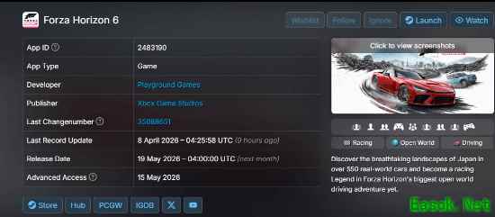 据 SteamDB 平台数据显示,《极限竞速:地平线 6》的 Steam 商店页面已正式开启预购,若官方后续无调整,游戏将在北京时间 5 月 19 日中午 12 点统一解锁。