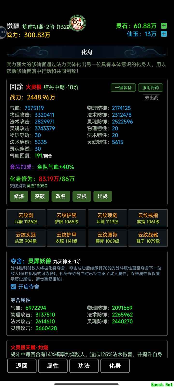 人物界面中的仙骨属性非常关键,能大幅提升攻击力,前期升级后基本可秒杀怪物(但也会被怪反秒)。预计后续渡劫开启的两个属性也能显著增强战力。