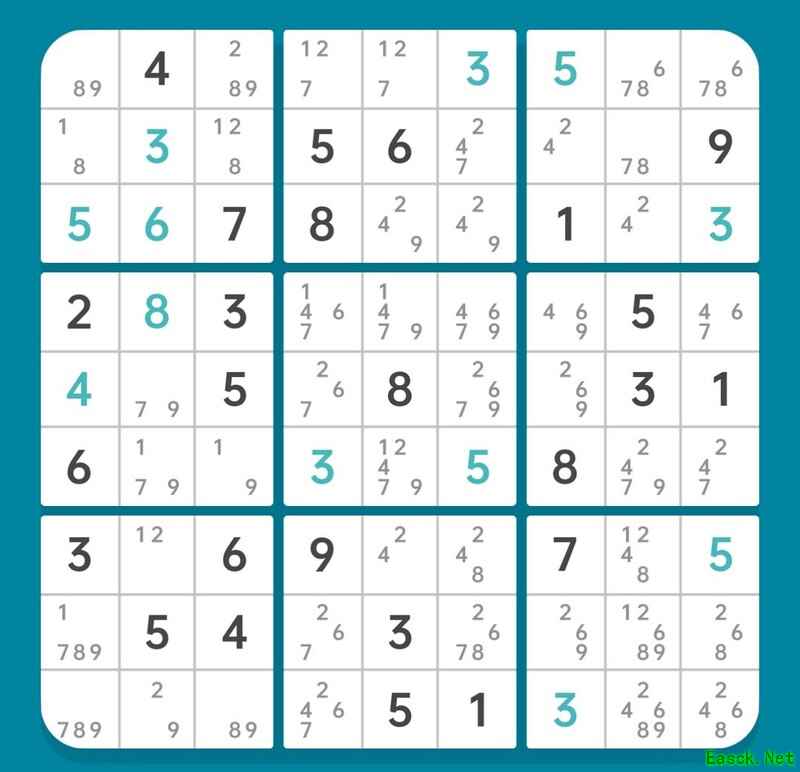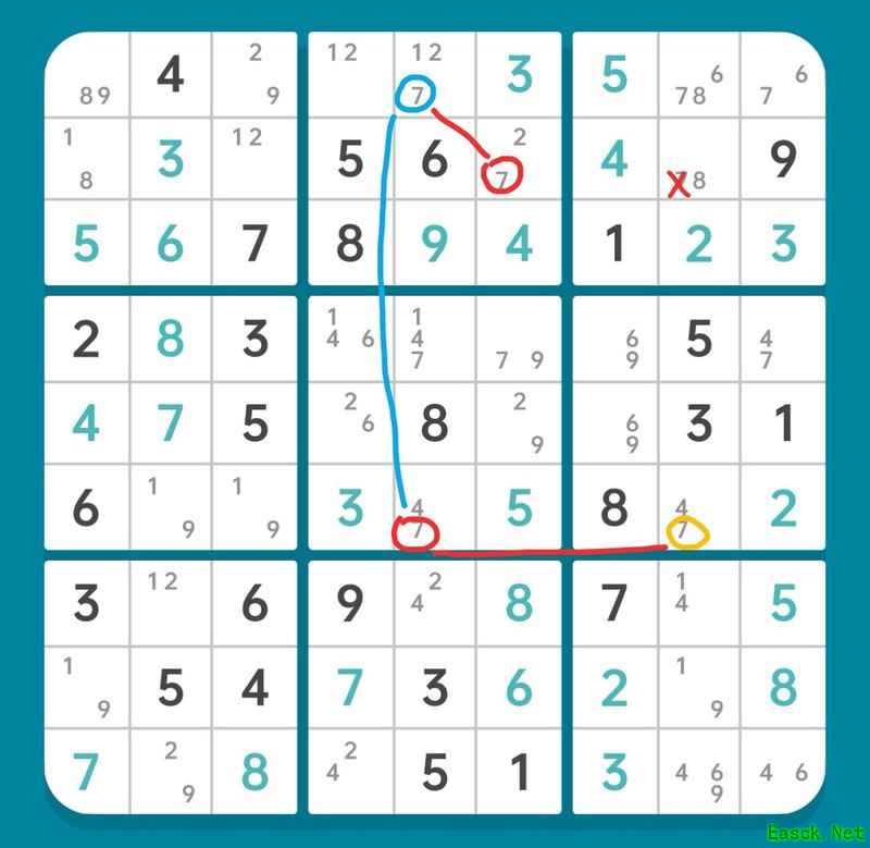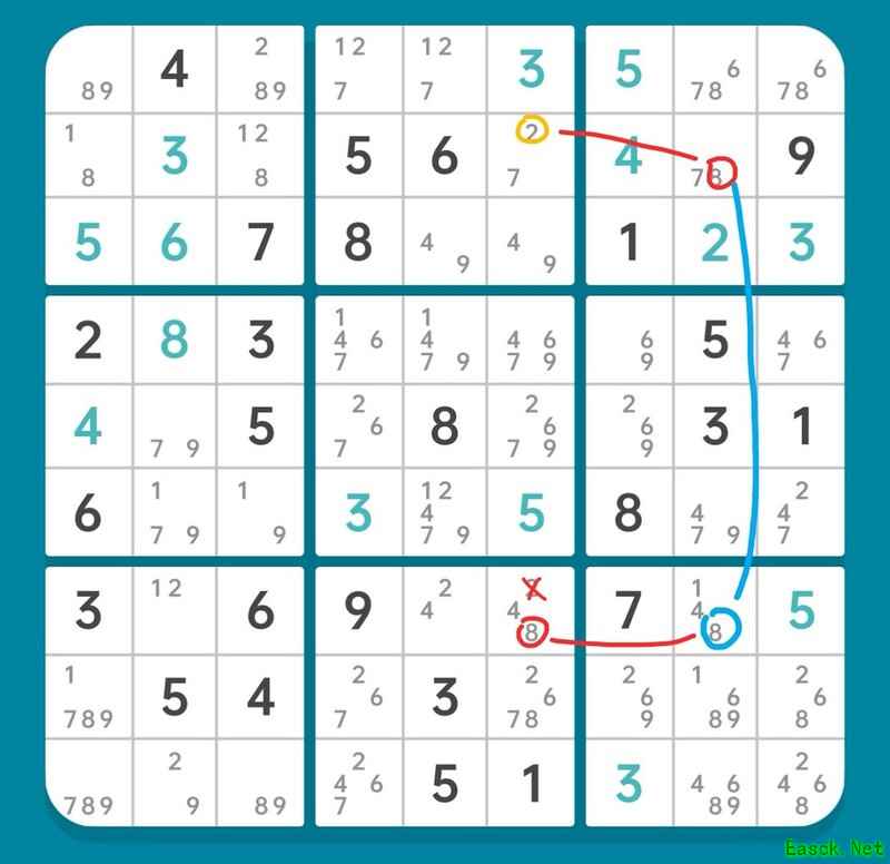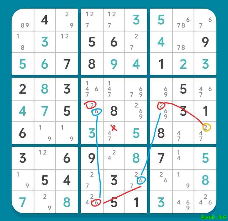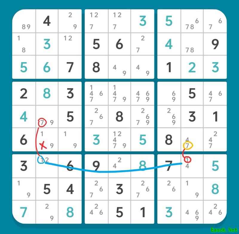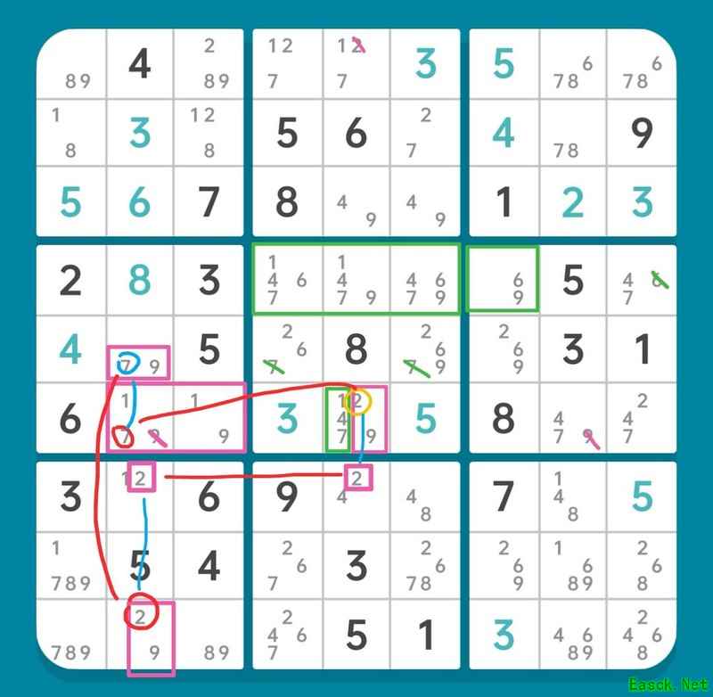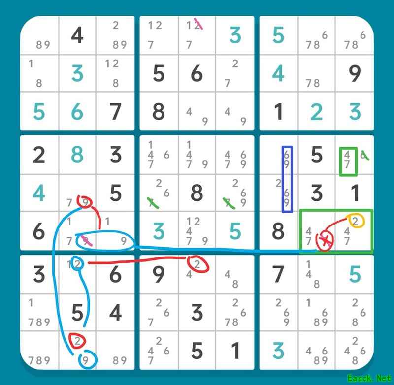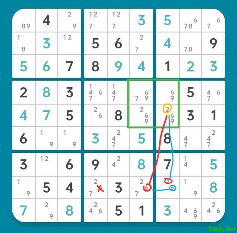 删除r6c5的候选数2,使r6c9确定为2,进而r45c7形成6和9的数组。