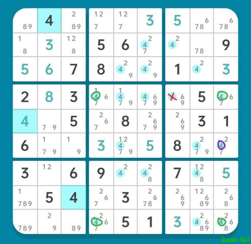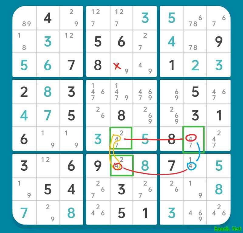15-1.6所示,绿框内构成XYZ-Wing结构,依据其基本规则,三个数字4形成强关联关系。