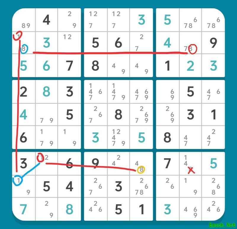粉线直接导致r1c5的2以及r6c2和r6c8的9被删除。