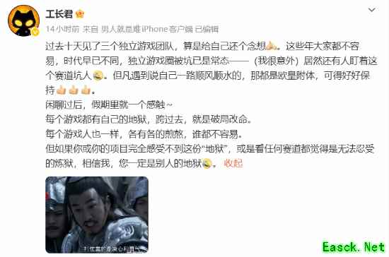 4月7日,网易单机游戏《剑心雕龙》制作人工长君发文,分享了近期与独立游戏团队交流后的感悟,直言独立游戏圈生存不易。