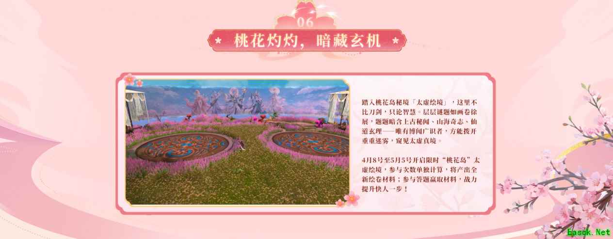 虚实交汇之处,当年桃花阵也化作了轩辕的“桃花岛”太虚绘境,4月8日至5月5日,画卷与谜题同展,谜题暗含上古秘闻、山海奇志、仙道玄理,等待博闻广识的天命者答出层层谜题,获得全新绘卷材料,以拼得绘卷全貌(注:参与次数单独计算)。