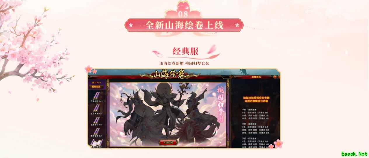 与此同时,全新山海绘卷也随新版本上线,经典服与自贸服山海绘卷皆新增“桃园归梦套装”,成功绘制绘卷所需全部卡牌,将激活意境强化功能,供天命者战力进一步提升。