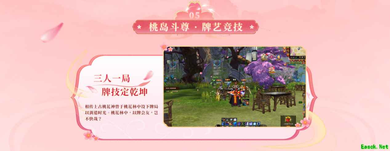 待到每日晚间,桃源牌圣牌局开启。醉里看桃源,牌局也为战,50人的比赛中,将汇聚轩辕各路牌艺高手,邀你在醉意朦胧中与强者一决高下。而在多人竞技之外,若寻得一隅闲,便可仅与二三知己作伴,来一局3人成局的桃岛斗尊,于林下定乾坤。