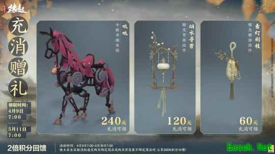 60元充消即可领取腰部挂件「素灯别枝」,素绫灯身缀鎏金竹枝,清逸出尘;120元充消可获背部挂件「烟水寻芳」,玉兰疏枝垂莹润灯盏,清辉流转,雅韵悠然;240元充消更能解锁全新坐骑「哒哒」,齿轮机枢铸飒爽身骨,红绸扬风,驰行江湖尽展桀骜意气。