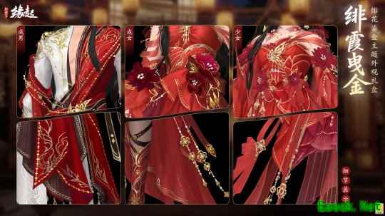 成女款以绯金织带挽起青丝,重瓣红花与细碎珠玉垂缀鬓侧。绯色织锦裁作露肩长裙,层叠薄纱铺就裙摆。裙身多重鎏金刺绣层叠排布,腰侧、袖间缀以盛放红瓣,衬得身姿绰约,明艳雍容。