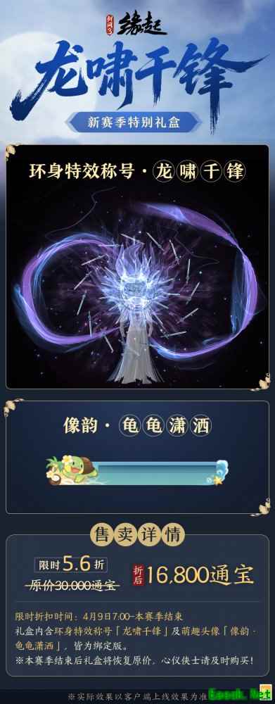 新赛季特别礼盒「龙啸千锋礼盒」今日重磅上线!内含霸气特效称号「龙啸千锋」,剑意凌然尽显侠者气度;更有软萌头像「像韵·龟龟潇洒」,憨态灵动伴你江湖行。现享有限时特惠,诚邀侠士珍藏!