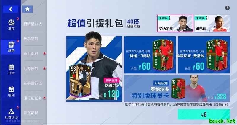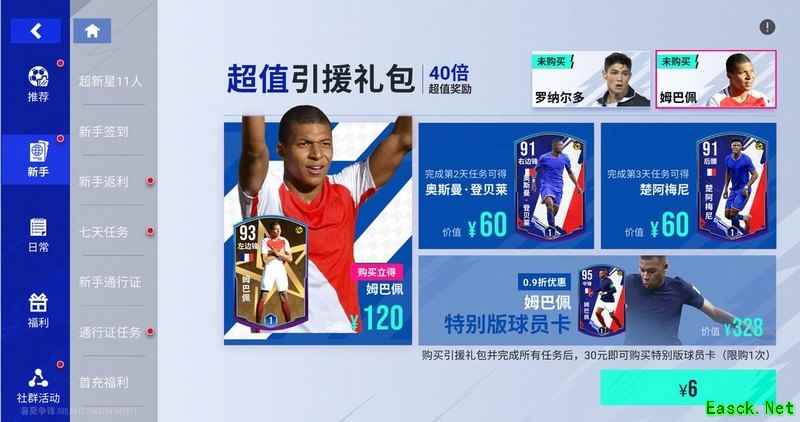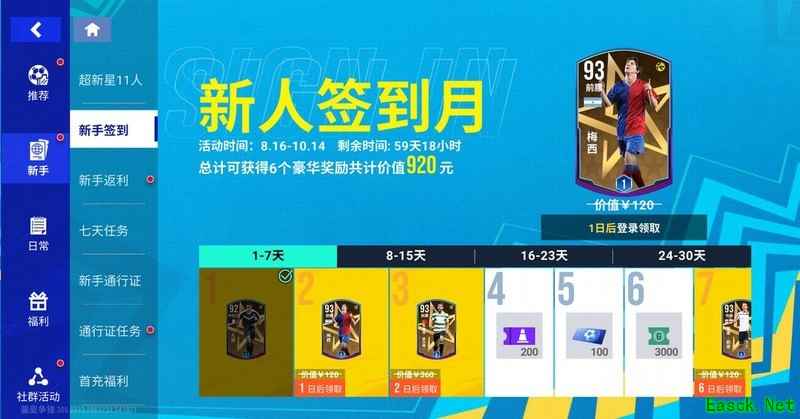 新人签到月活动期间,新手每日签到除可获得蓝券、绿券和技术卡等常规奖励外,还可额外领取总价值920元的6份豪华礼包,轻松入手孔德、梅西、布鲁诺·费尔南德斯、鲁本·迪亚斯等热门球员系列!